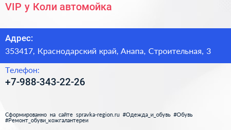 VIP y Коли, автомойка по адресу 353417, Краснодарский край, Анапа, Строительная, 3 в дальнейшем Организация, размещена в следующих категориях: