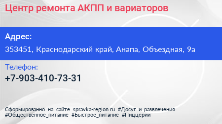 Центр ремонта АКПП и вариаторов по адресу 353451, Краснодарский край, Анапа, Объездная, 9а в дальнейшем Организация, размещена в следующих категориях: