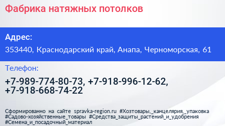 Фабрика натяжных потолков по адресу 353440, Краснодарский край, Анапа, Черноморская, 61 в дальнейшем Организация, размещена в следующих категориях: