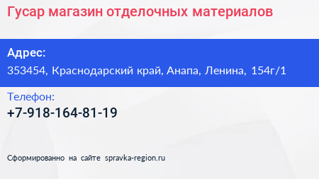 Гусар, магазин отделочных материалов по адресу 353454, Краснодарский край, Анапа, Ленина, 154г/1 в дальнейшем Организация, размещена в следующих категориях: