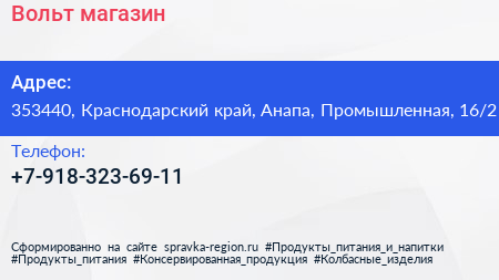 Вольт, магазин по адресу 353440, Краснодарский край, Анапа, Промышленная, 16/2 в дальнейшем Организация, размещена в следующих категориях: