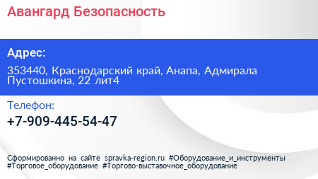 Авангард Безопасность по адресу 353440, Краснодарский край, Анапа, Адмирала Пустошкина, 22 лит4 в дальнейшем Организация, размещена в следующих категориях: