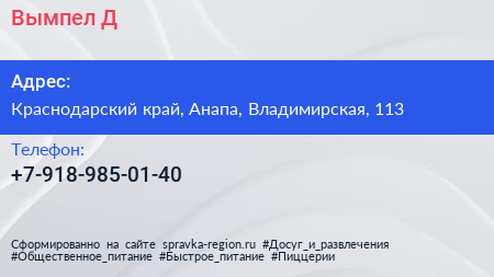 Вымпел-Д по адресу Краснодарский край, Анапа, Владимирская, 113 в дальнейшем Организация, размещена в следующих категориях: