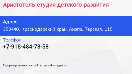 Аристотель, студия детского развития по адресу 353440, Краснодарский край, Анапа, Терская, 115 в дальнейшем Организация, размещена в следующих категориях: