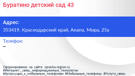 Буратино, детский сад №43 по адресу 353419, Краснодарский край, Анапа, Мира, 25а в дальнейшем Организация, размещена в следующих категориях: