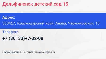 Дельфиненок, детский сад №15 по адресу 353417, Краснодарский край, Анапа, Черноморская, 15 в дальнейшем Организация, размещена в следующих категориях: