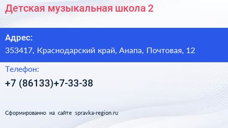 Детская музыкальная школа №2 по адресу 353417, Краснодарский край, Анапа, Почтовая, 12 в дальнейшем Организация, размещена в следующих категориях: