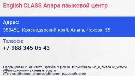 English CLASS Anapa, языковой центр по адресу 353451, Краснодарский край, Анапа, Чехова, 55 в дальнейшем Организация, размещена в следующих категориях: