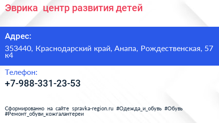 Эврика+, центр развития детей по адресу 353440, Краснодарский край, Анапа, Рождественская, 57 к4 в дальнейшем Организация, размещена в следующих категориях: