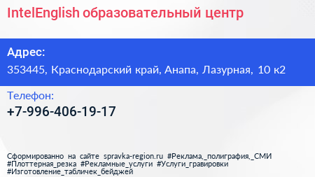 IntelEnglish, образовательный центр по адресу 353445, Краснодарский край, Анапа, Лазурная, 10 к2 в дальнейшем Организация, размещена в следующих категориях: