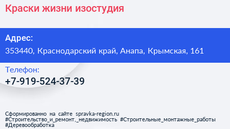 Краски жизни, изостудия по адресу 353440, Краснодарский край, Анапа, Крымская, 161 в дальнейшем Организация, размещена в следующих категориях: