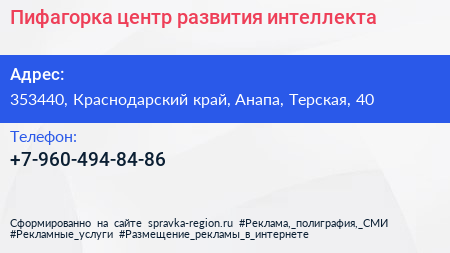 Пифагорка, центр развития интеллекта по адресу 353440, Краснодарский край, Анапа, Терская, 40 в дальнейшем Организация, размещена в следующих категориях: