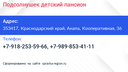 Подсолнушек, детский пансион по адресу 353417, Краснодарский край, Анапа, Кооперативная, 36 в дальнейшем Организация, размещена в следующих категориях: