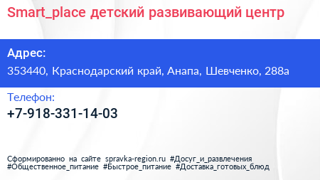 Smart_place, детский развивающий центр по адресу 353440, Краснодарский край, Анапа, Шевченко, 288а в дальнейшем Организация, размещена в следующих категориях: