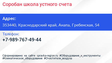 Соробан, школа устного счета по адресу 353440, Краснодарский край, Анапа, Гребенская, 54 в дальнейшем Организация, размещена в следующих категориях: