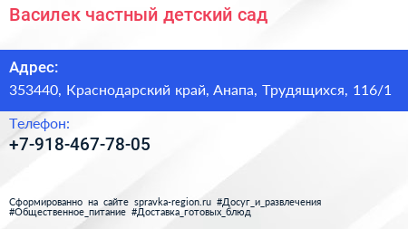 Василек, частный детский сад по адресу 353440, Краснодарский край, Анапа, Трудящихся, 116/1 в дальнейшем Организация, размещена в следующих категориях: