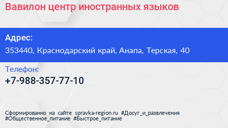Вавилон, центр иностранных языков по адресу 353440, Краснодарский край, Анапа, Терская, 40 в дальнейшем Организация, размещена в следующих категориях: