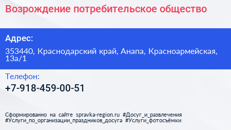 Возрождение, потребительское общество по адресу 353440, Краснодарский край, Анапа, Красноармейская, 13а/1 в дальнейшем Организация, размещена в следующих категориях: