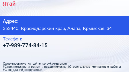 Ятай по адресу 353440, Краснодарский край, Анапа, Крымская, 34 в дальнейшем Организация, размещена в следующих категориях: