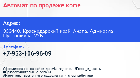 Автомат по продаже кофе по адресу 353440, Краснодарский край, Анапа, Адмирала Пустошкина, 22Б в дальнейшем Организация, размещена в следующих категориях: