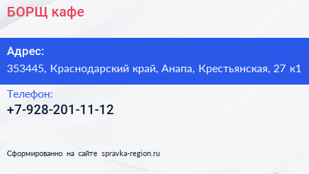 БОРЩ, кафе по адресу 353445, Краснодарский край, Анапа, Крестьянская, 27 к1 в дальнейшем Организация, размещена в следующих категориях: