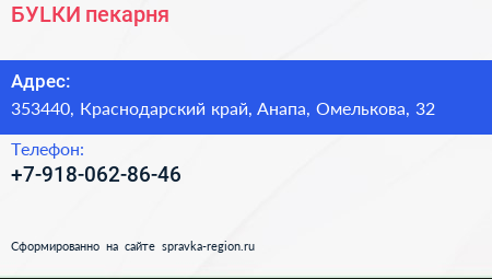 БУLКИ, пекарня по адресу 353440, Краснодарский край, Анапа, Омелькова, 32 в дальнейшем Организация, размещена в следующих категориях: