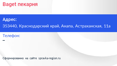 Baget, пекарня по адресу 353440, Краснодарский край, Анапа, Астраханская, 11а в дальнейшем Организация, размещена в следующих категориях: