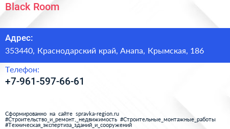 Black Room по адресу 353440, Краснодарский край, Анапа, Крымская, 186 в дальнейшем Организация, размещена в следующих категориях: