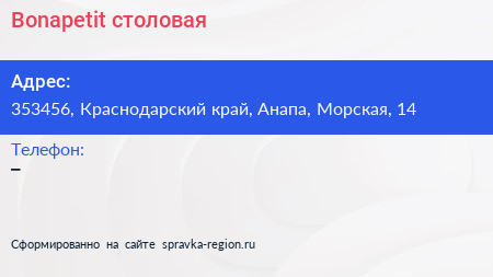 Bonapetit, столовая по адресу 353456, Краснодарский край, Анапа, Морская, 14 в дальнейшем Организация, размещена в следующих категориях: