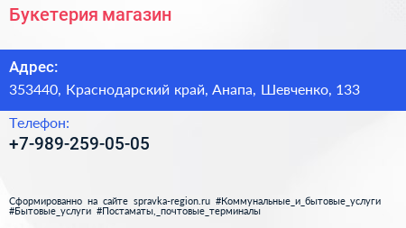 Букетерия, магазин по адресу 353440, Краснодарский край, Анапа, Шевченко, 133 в дальнейшем Организация, размещена в следующих категориях:
