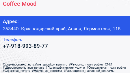 Coffee Mood по адресу 353440, Краснодарский край, Анапа, Лермонтова, 118 в дальнейшем Организация, размещена в следующих категориях: