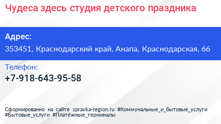Чудеса здесь, студия детского праздника по адресу 353451, Краснодарский край, Анапа, Краснодарская, 66 в дальнейшем Организация, размещена в следующих категориях: