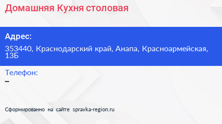 Домашняя Кухня, столовая по адресу 353440, Краснодарский край, Анапа, Красноармейская, 13Б в дальнейшем Организация, размещена в следующих категориях: