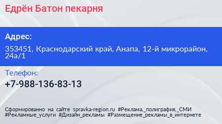 Едрён-Батон, пекарня по адресу 353451, Краснодарский край, Анапа, 12-й микрорайон, 24а/1 в дальнейшем Организация, размещена в следующих категориях: