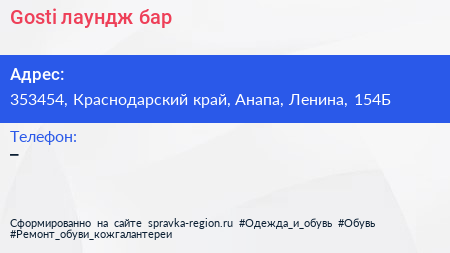 Gosti, лаундж-бар по адресу 353454, Краснодарский край, Анапа, Ленина, 154Б в дальнейшем Организация, размещена в следующих категориях: