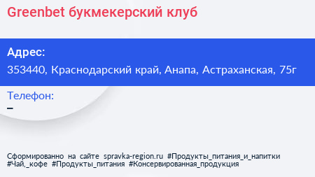 Greenbet, букмекерский клуб по адресу 353440, Краснодарский край, Анапа, Астраханская, 75г в дальнейшем Организация, размещена в следующих категориях: