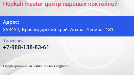 Hookah master, центр паровых коктейлей по адресу 353454, Краснодарский край, Анапа, Ленина, 181 в дальнейшем Организация, размещена в следующих категориях: