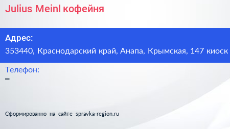 Julius Meinl, кофейня по адресу 353440, Краснодарский край, Анапа, Крымская, 147 киоск в дальнейшем Организация, размещена в следующих категориях: