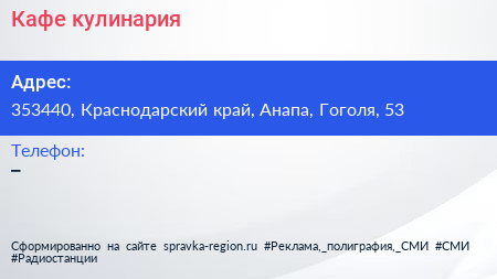 Кафе-кулинария по адресу 353440, Краснодарский край, Анапа, Гоголя, 53 в дальнейшем Организация, размещена в следующих категориях: