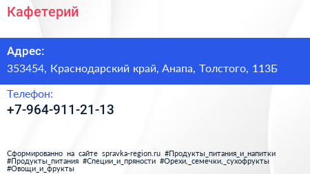 Кафетерий по адресу 353454, Краснодарский край, Анапа, Толстого, 113Б в дальнейшем Организация, размещена в следующих категориях: