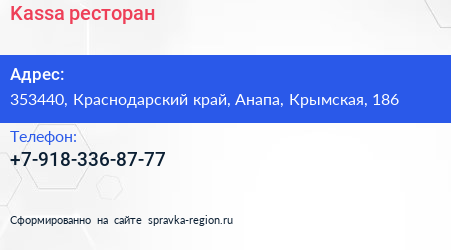 Kassa, ресторан по адресу 353440, Краснодарский край, Анапа, Крымская, 186 в дальнейшем Организация, размещена в следующих категориях:
