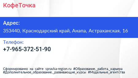 КофеТочка по адресу 353440, Краснодарский край, Анапа, Астраханская, 16 в дальнейшем Организация, размещена в следующих категориях:
