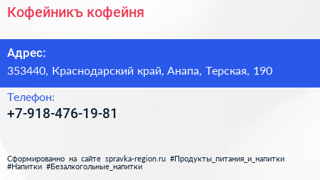 Кофейникъ, кофейня по адресу 353440, Краснодарский край, Анапа, Терская, 190 в дальнейшем Организация, размещена в следующих категориях: