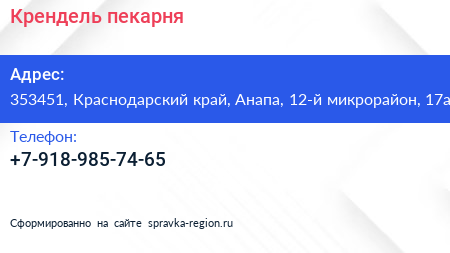 Крендель, пекарня по адресу 353451, Краснодарский край, Анапа, 12-й микрорайон, 17а в дальнейшем Организация, размещена в следующих категориях: