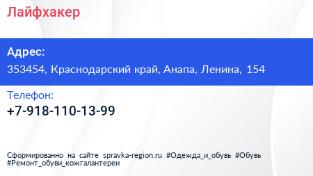 Лайфхакер по адресу 353454, Краснодарский край, Анапа, Ленина, 154 в дальнейшем Организация, размещена в следующих категориях: