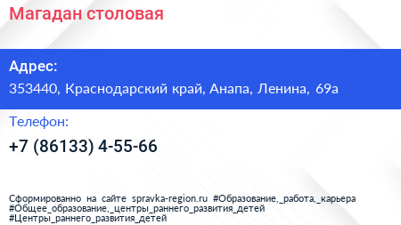 Магадан, столовая по адресу 353440, Краснодарский край, Анапа, Ленина, 69а в дальнейшем Организация, размещена в следующих категориях:
