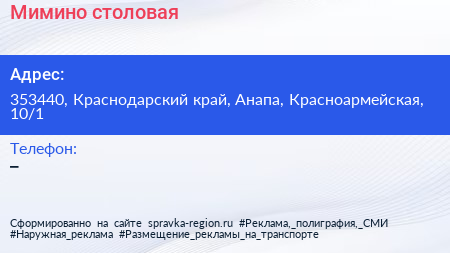 Мимино, столовая по адресу 353440, Краснодарский край, Анапа, Красноармейская, 10/1 в дальнейшем Организация, размещена в следующих категориях: