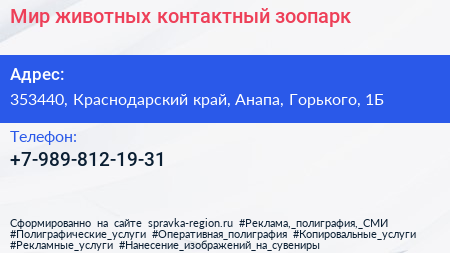 Мир животных, контактный зоопарк по адресу 353440, Краснодарский край, Анапа, Горького, 1Б в дальнейшем Организация, размещена в следующих категориях: