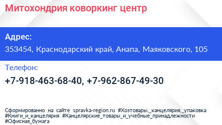 Митохондрия, коворкинг-центр по адресу 353454, Краснодарский край, Анапа, Маяковского, 105 в дальнейшем Организация, размещена в следующих категориях: