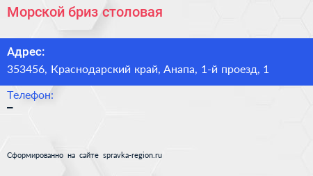 Морской бриз, столовая по адресу 353456, Краснодарский край, Анапа, 1-й проезд, 1 в дальнейшем Организация, размещена в следующих категориях: